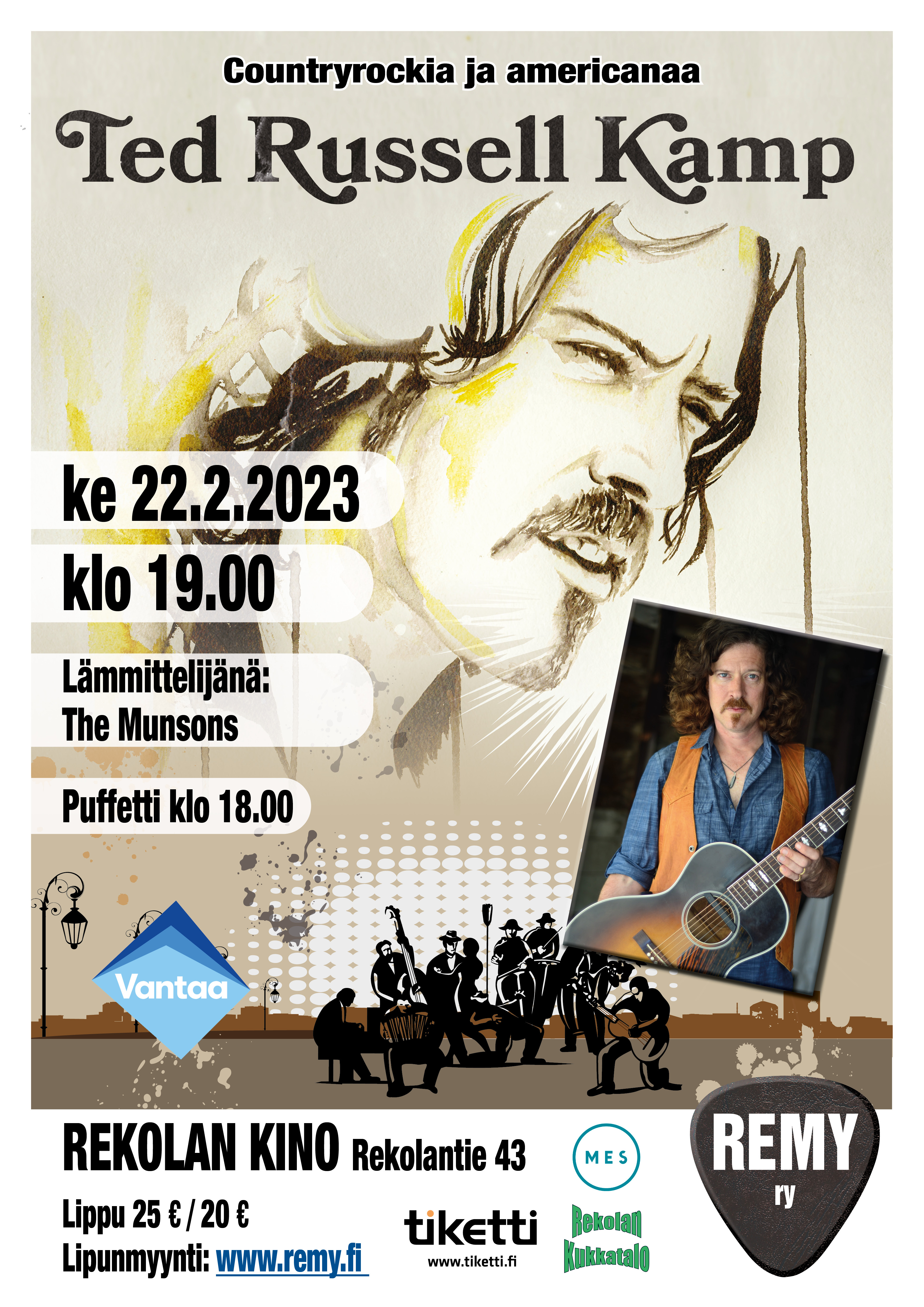 Amerikkalainen laulaja-lauluntekijä Ted Russell Kamp tekee keväällä 2023 muutaman keikan Suomessa. Rekolan Kino on yksi konserttipaikoista. 11 omaa albumia julkaissut basisti-laulaja ammentaa laulujensa ainekset amerikkalaisesta perinnemusiikista, ennenkaikkea countrysta.